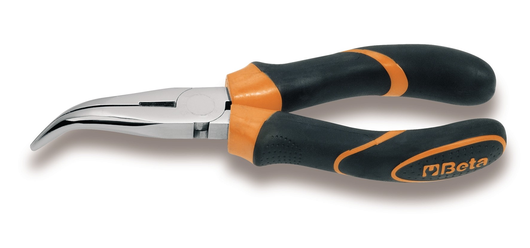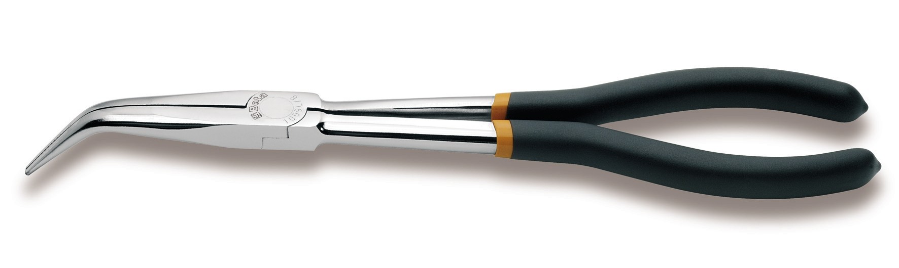 Curved extra long knurled nose pliers, 45°, for special operations, slip-proof double layer PVC coated handles