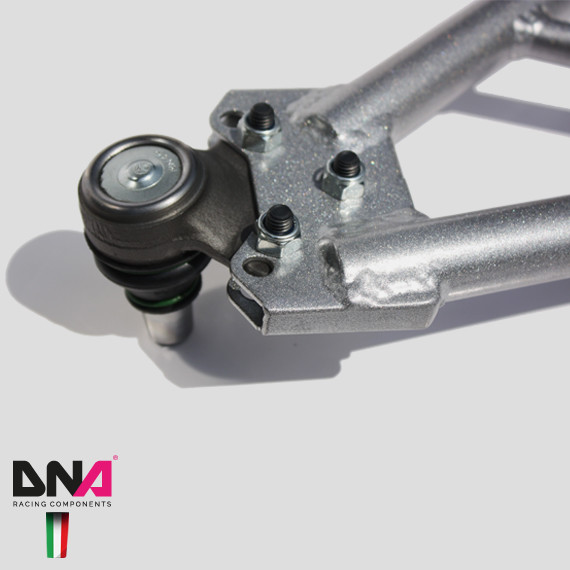 These suspension arms kit intended for track day, road and racing applications, have been designed to improve the stiffness and strength of the arms, to decrease weight of the masses on the ground and to eliminate unwanted movement of the wheels, caused by the excessive elasticity of the original silent blocks. The system includes high-quality motorsport uniballs. The kit also includes a new system of protection of the uniballs against dirt that makes arms maintenance-free and ideal for road use. Results: improvement of the handling and of the steering system, better control of the characteristic angles of the suspension, improvement of braking and especially elimination of the tendency to “wave” during the acceleration phase. A MUST for cars over 180 hp. The kit includes the front arms, strut spherical bearings, two racing uniballs together with their protections against dirt and all the hardness needed.