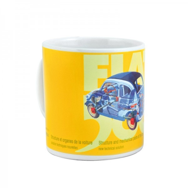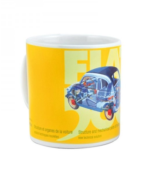 Yellow Fiat 500 ceramic mug with Fiat technical illustration, packaged in a carton box. Size 3.5″ D