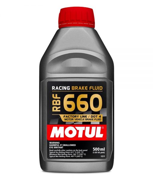 MOTUL RBF 660 Factory Line Brake Fluid is 100% Synthetic Racing Fluid – DOT 4 for extreme temperature & racing applications. All types of hydraulic brake and clutch actuators requiring non-silicone synthetic fluid. Widely exceeds the DOT 3, DOT4 and DOT 5.1 standards (except for DOT 5.1 viscosity at – 40°C). EXTREME THERMAL RESISTANCE AND STABILITY: Very high boiling point (325°C / 617°F), superior to conventional DOT 5.1 non silicone base, DOT 5 silicone base fluids, and DOT4. MOTUL RBF 660 enables effective braking even under extreme conditions. EFFICIENT WHEN RAINY: Very high wet boiling point (204°C / 400°F) far exceeds the requirements of DOT 3 & 4 & DOT 5.1 enabling brake efficiency while rainy. Reduces the risk of the “vapor lock” phenomena. Amber in color. Do not mix with silicone (DOT 5 silicone base) or mineral base fluids (LHM).