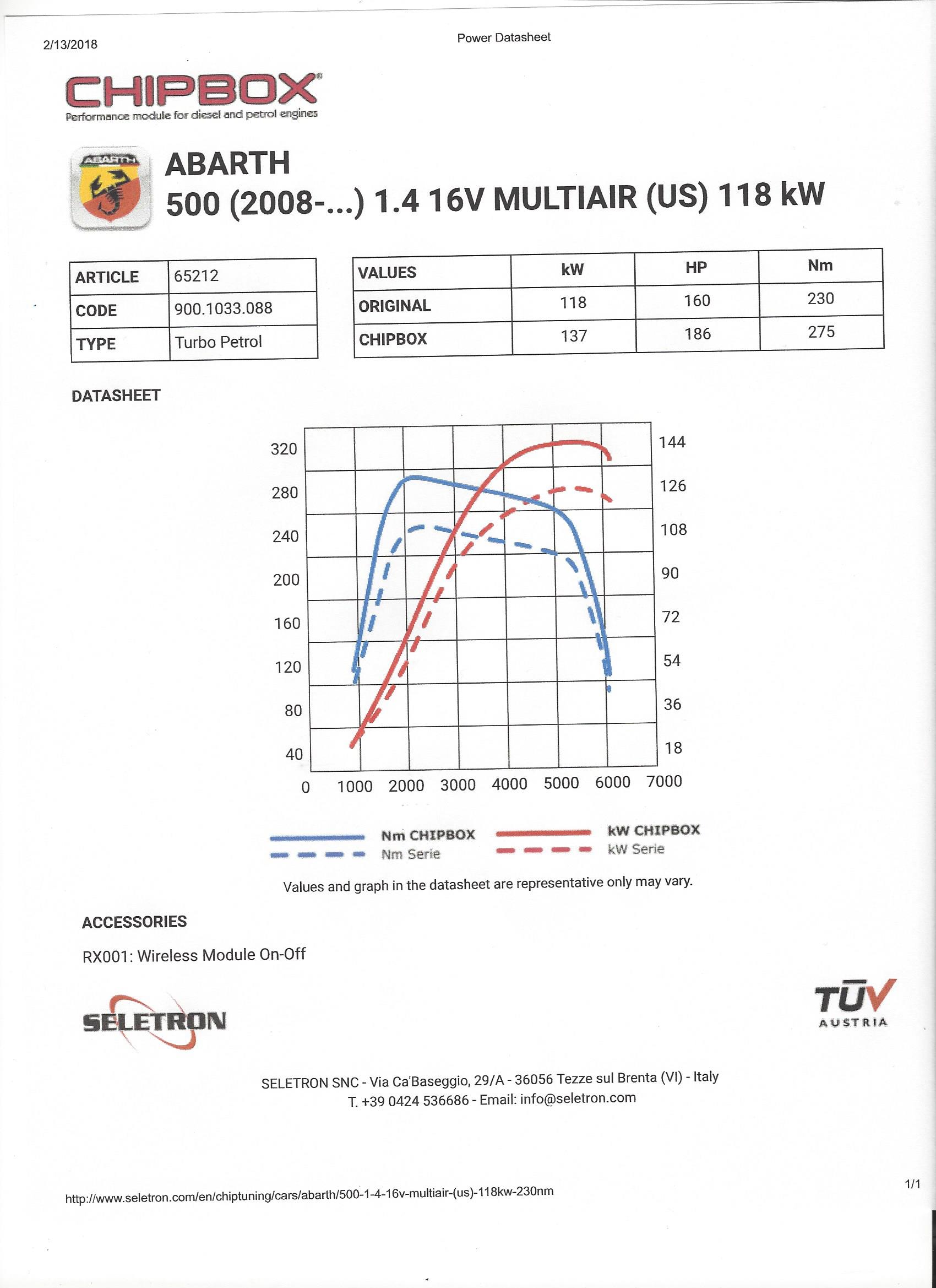 Seletron Chipbox for Abarth 500 is Made in Italy and TUV approved. No engine lite or state inspection issues. Add 28 dependable horsepower. One hour installation time.